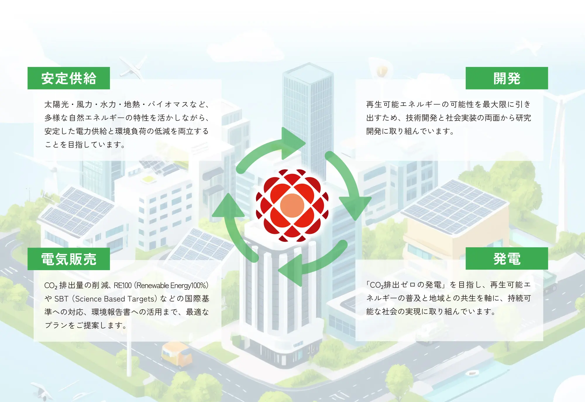 企業情報About the Company 事業紹介What We Do ゼロワットパワーは再生可能エネルギーに特化し、トータルで事業を展開しています。 電力の提供 ① 小売電気事業 公共機関 脱炭素企業 個人 電力の創出 ② 発電事業 燃料開発 電源開発 電力の集結 ③ アグリゲート事業 太陽光/風力 地熱/バイオマス 水力